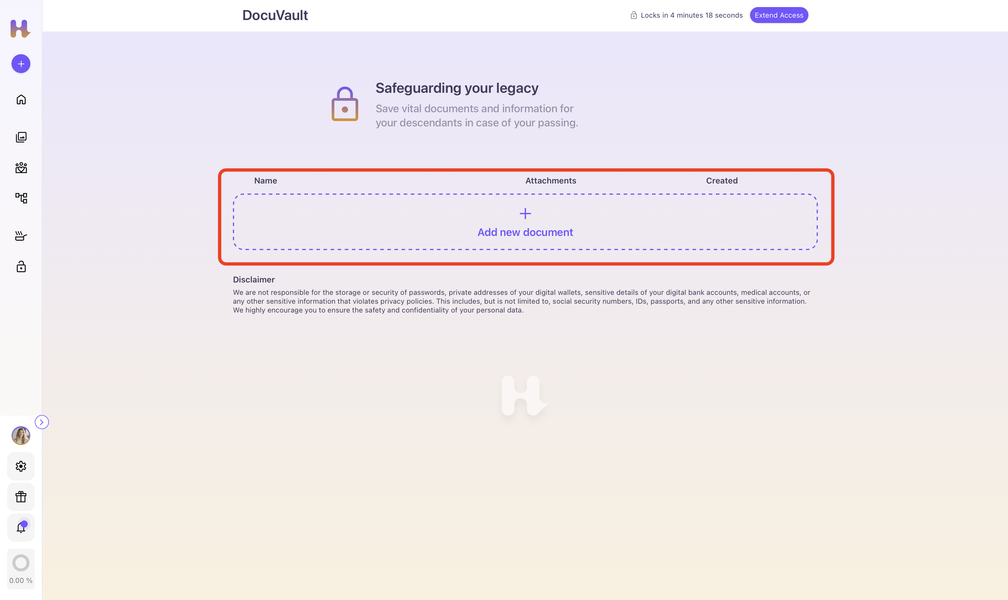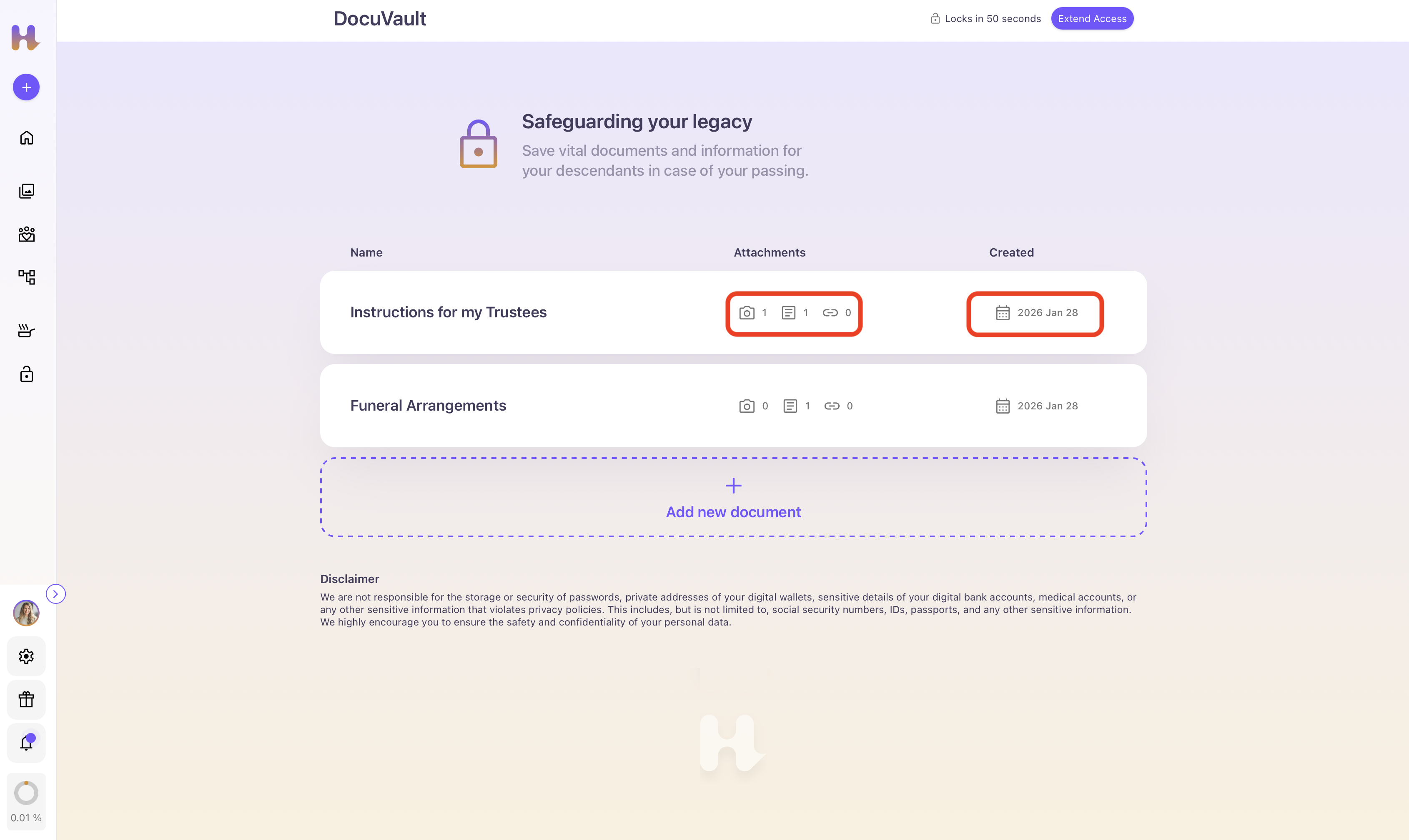 This “Extend Access” button is located on the top right corner of your DocuVault home page, next to the timer displaying your remaining minutes and seconds before it auto-locks.