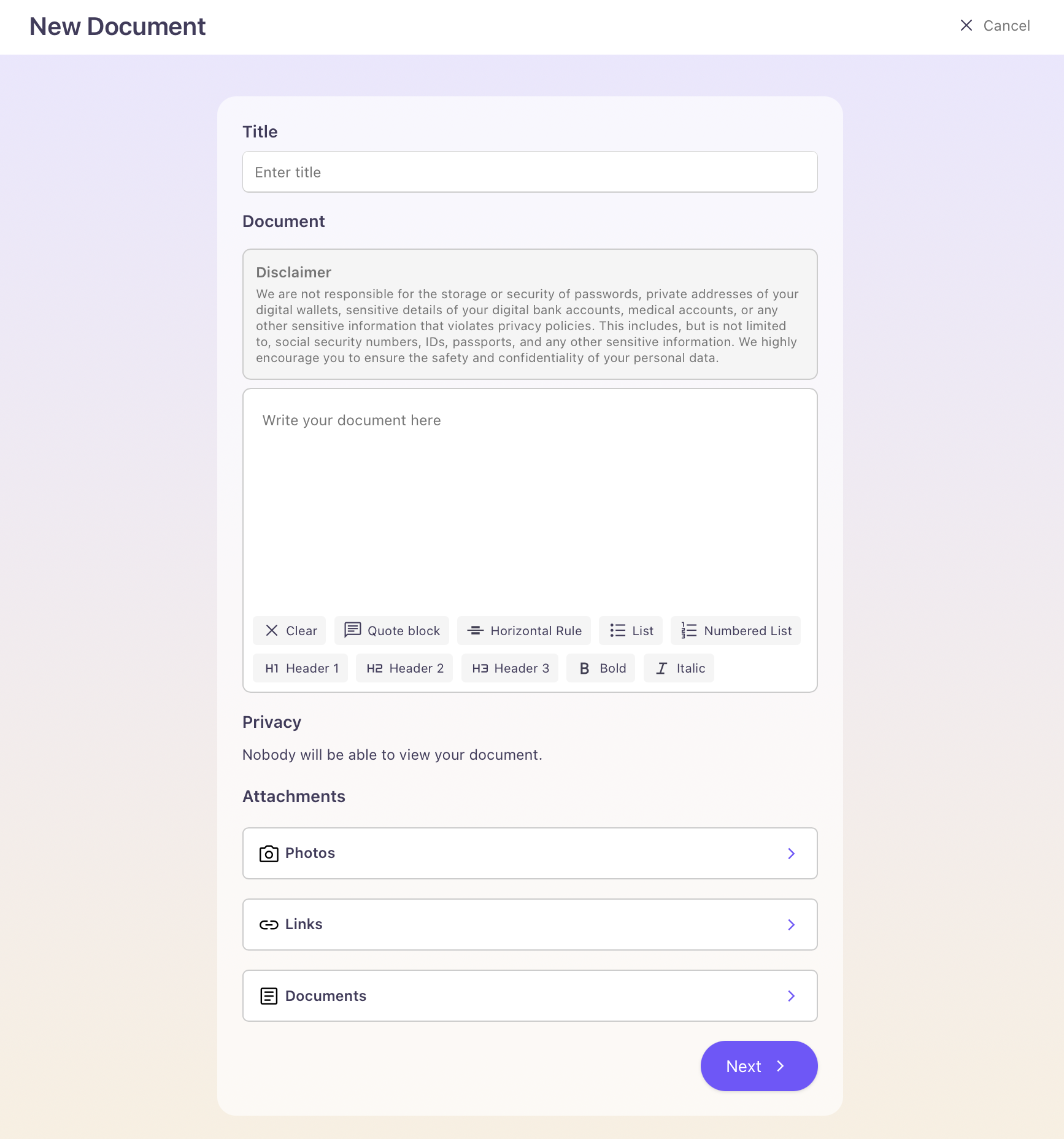 For a seamless process, we recommend having any media or links ready and accessible on your device before you add a new document, due to a 5 minute time limit which may run out while you're uploading a file.