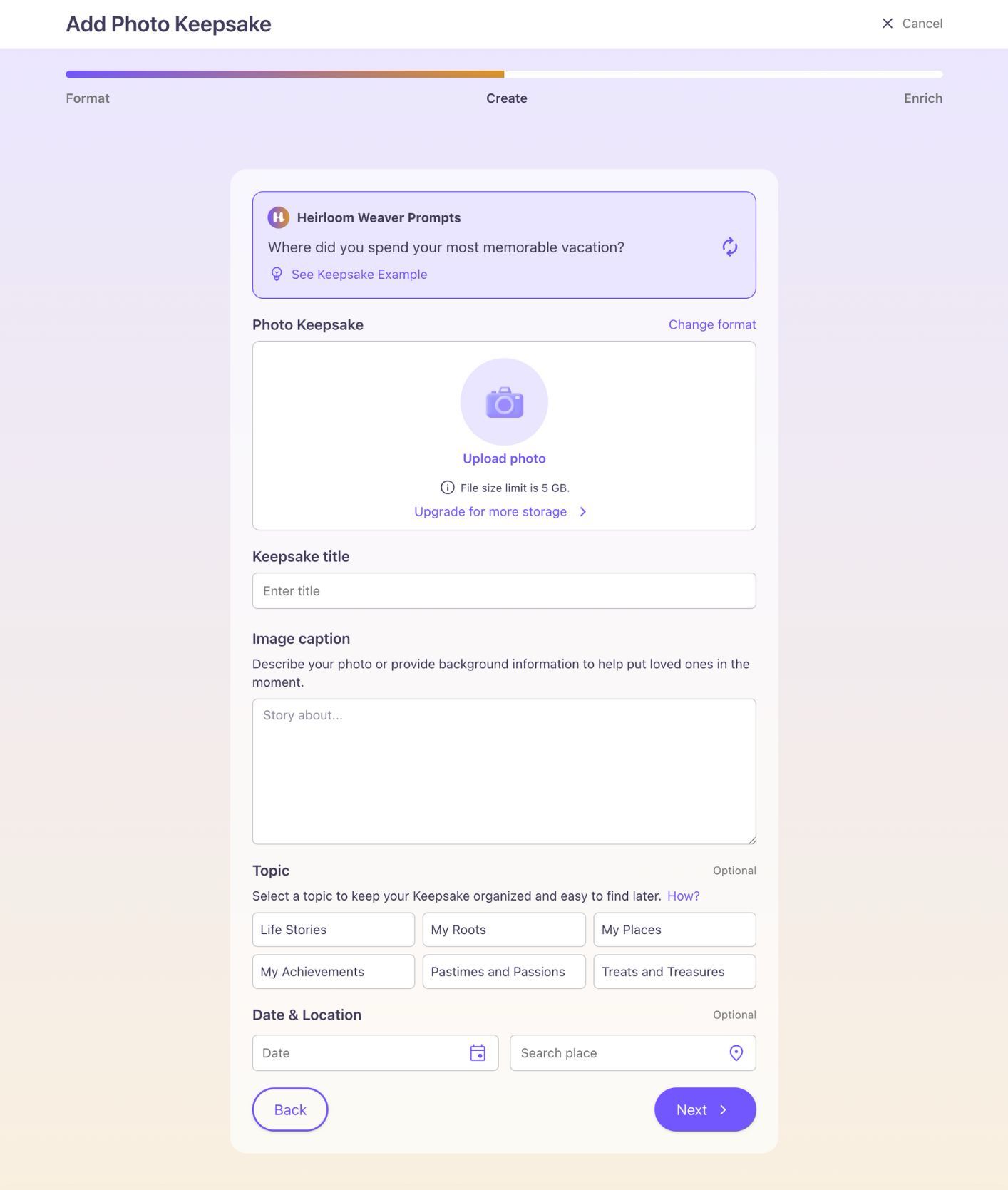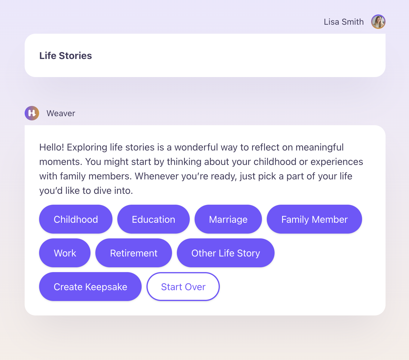 After selecting a topic, Weaver (your AI assistant) will offer areas of inspiration to help recall details of the memory for creating your Keepsake. Additionally, you can jump straight in and click "Create Keepsake" once you’ve got your idea, or you can click "Start Over" to refresh Weaver's offers.