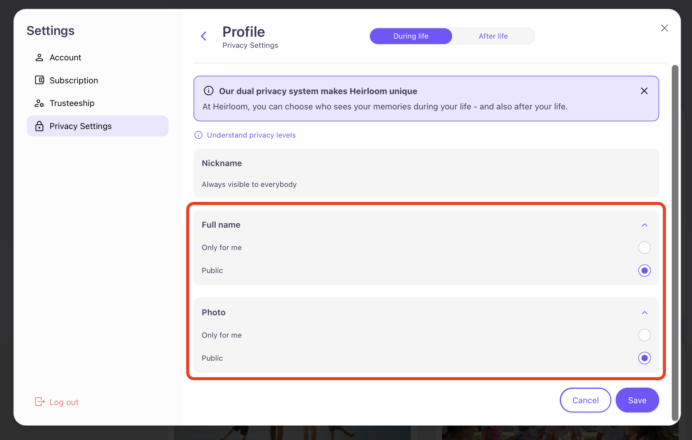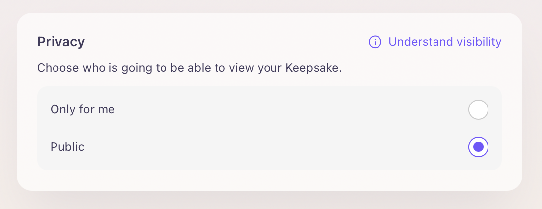 Please note that if you select a Keepsake to be "Public", then your profile will become public too. You can control the visibility of your profile in your "Privacy Settings".
