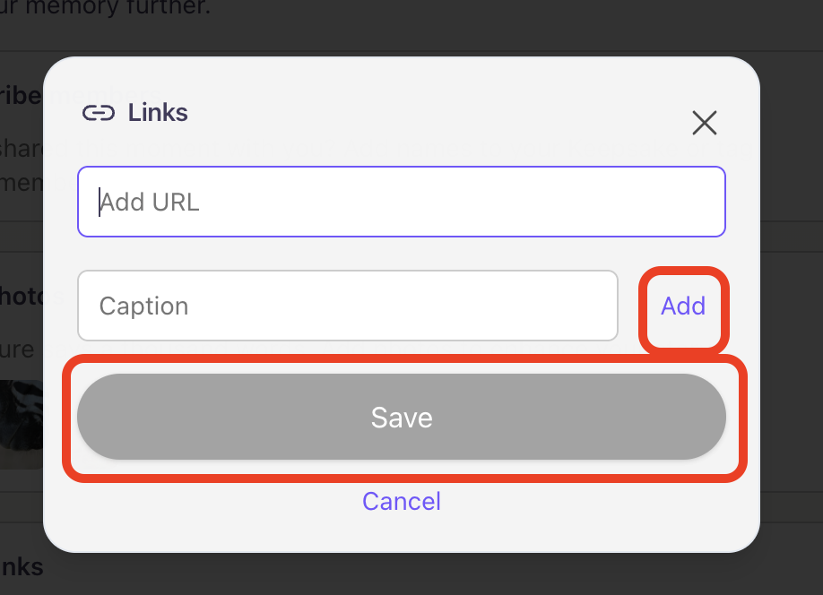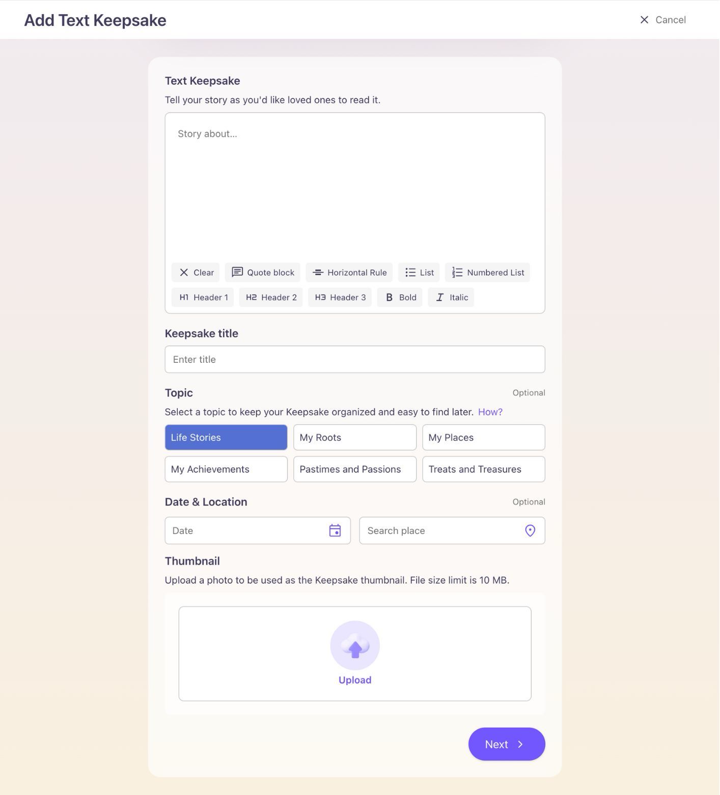 We understand that writing about a memory after time has passed can be difficult, so we recommend drafting any Keepsake entry--especially text--in a separate place on your device to save it from potential loss due to connectivity or browser issues.