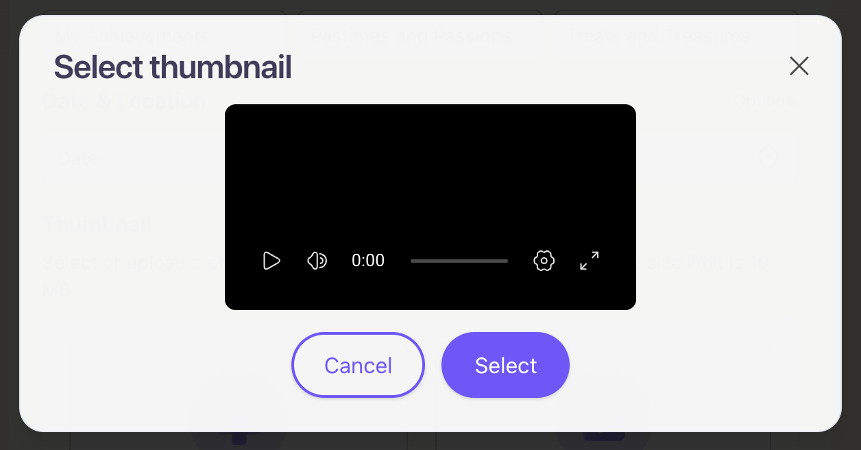 The last part of your Video Keepsake is a cover picture (titled "Thumbnail"), which you can either upload as an image, or you can take a picture of a single frame from the video as your Thumbnail.
