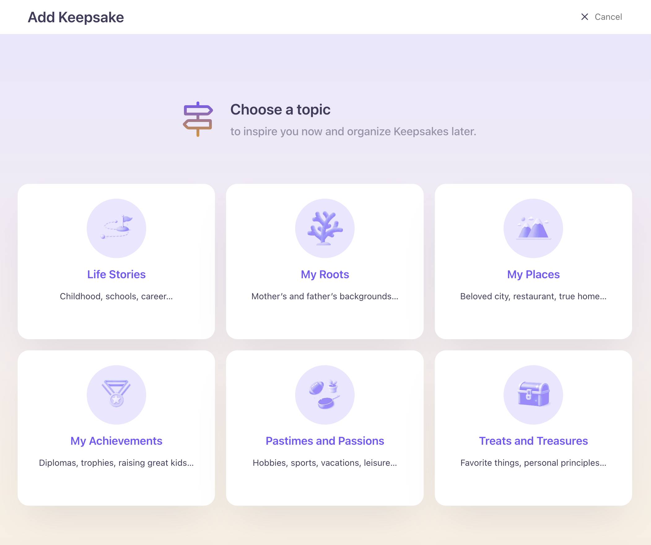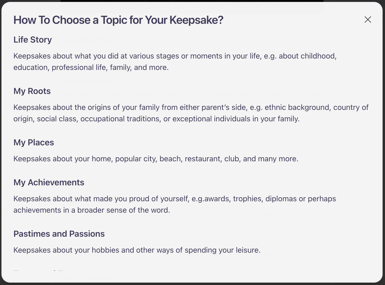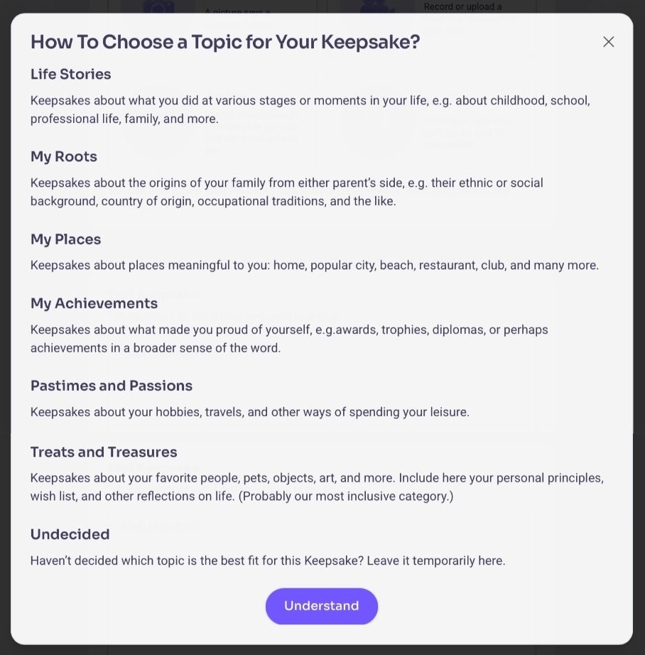 After clicking on your starting point, you’ll be prompted to select one of the following topics to help categorize and organize your Keepsakes in your Legacy Room.
