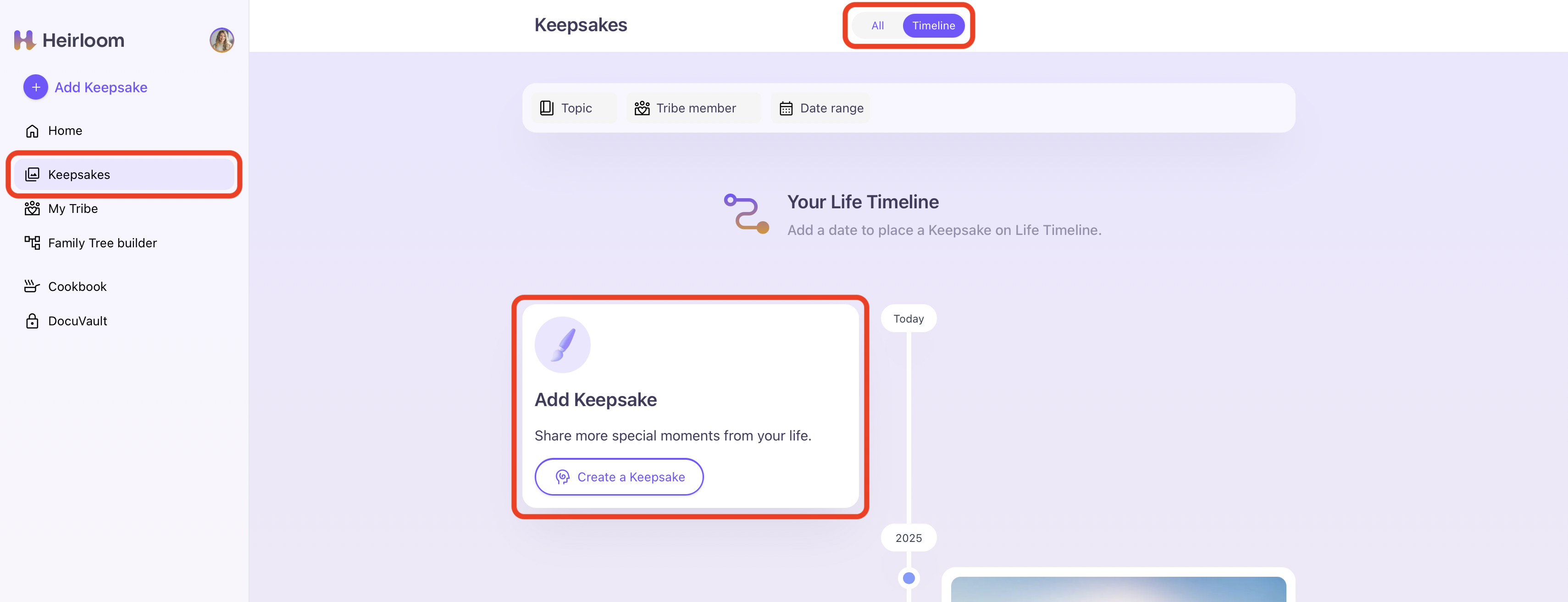 'Timeline' view of the Keepsake area showing where to add a Keepsake.