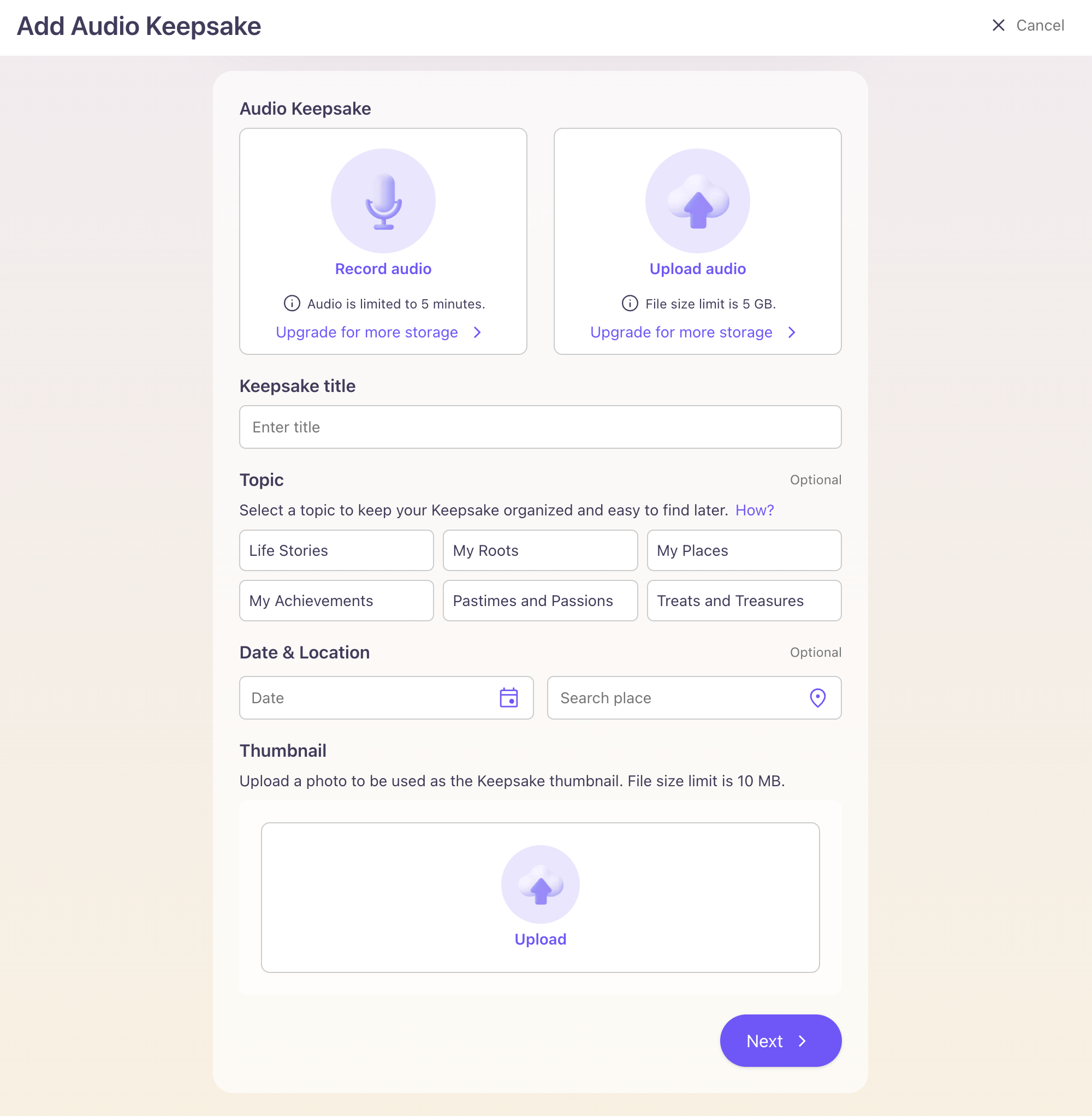 After giving the audio Keepsake a title, and a relevant description of its context and significance, you can adjust the topic for organization, add the date, and even tag a location. Finish the core details of your Keepsake with a cover photo uploaded as the Thumbnail.