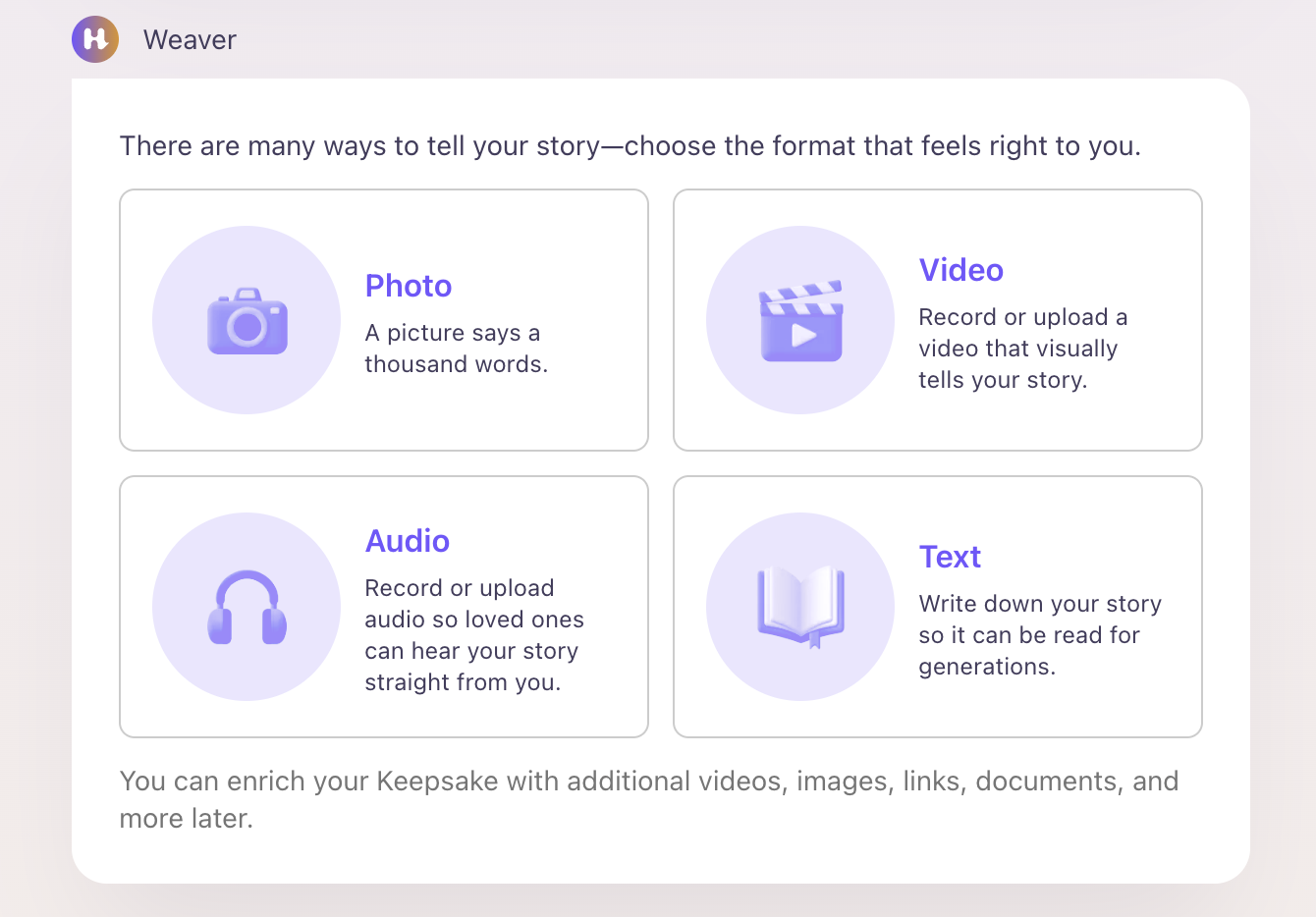 You’ll then be prompted to select the format of the Keepsake you’d like to create (ie. Photo, Video, Audio, or Text).