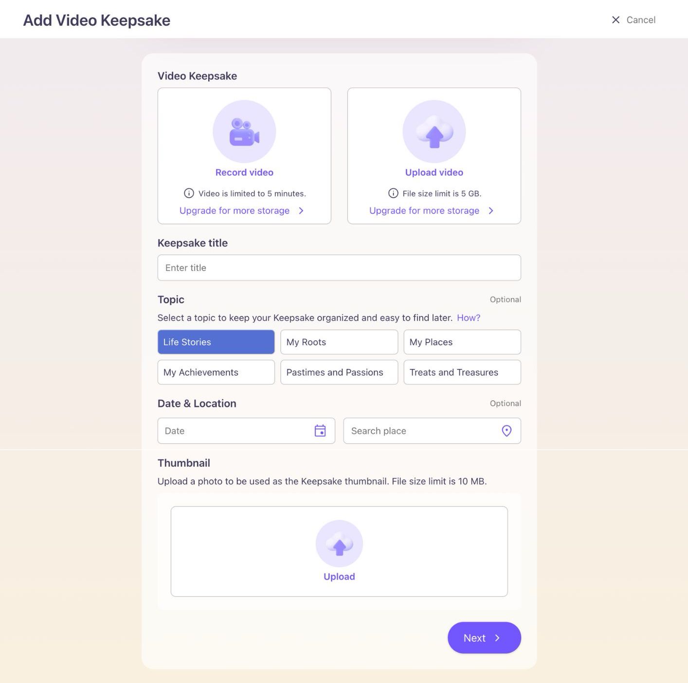 Record a video on the webpage or upload a video file to your Keepsake and give it a brief title to describe the content of the video or the related story (you’ll be able to add more information later too).