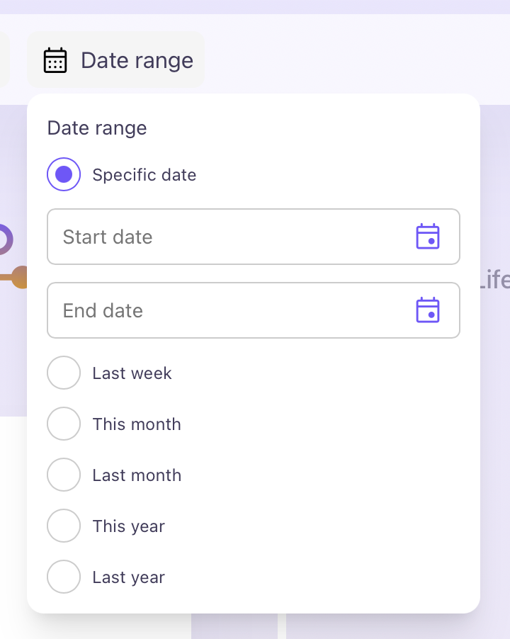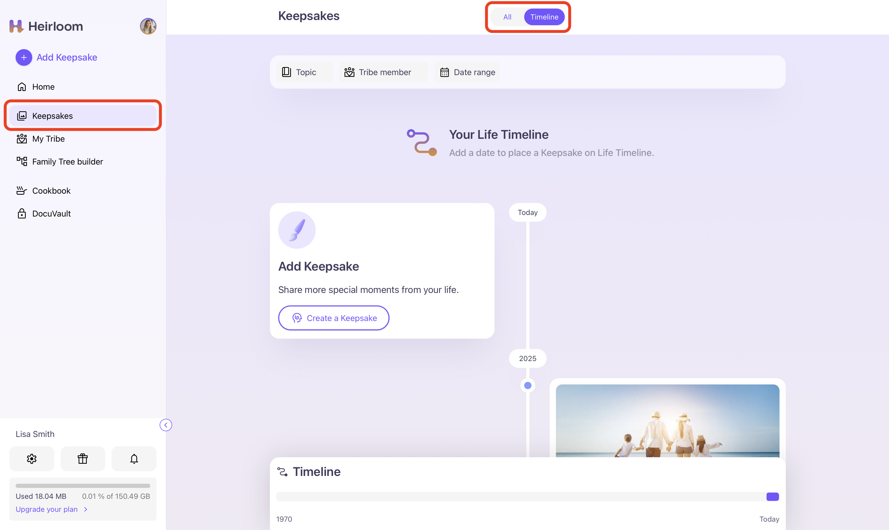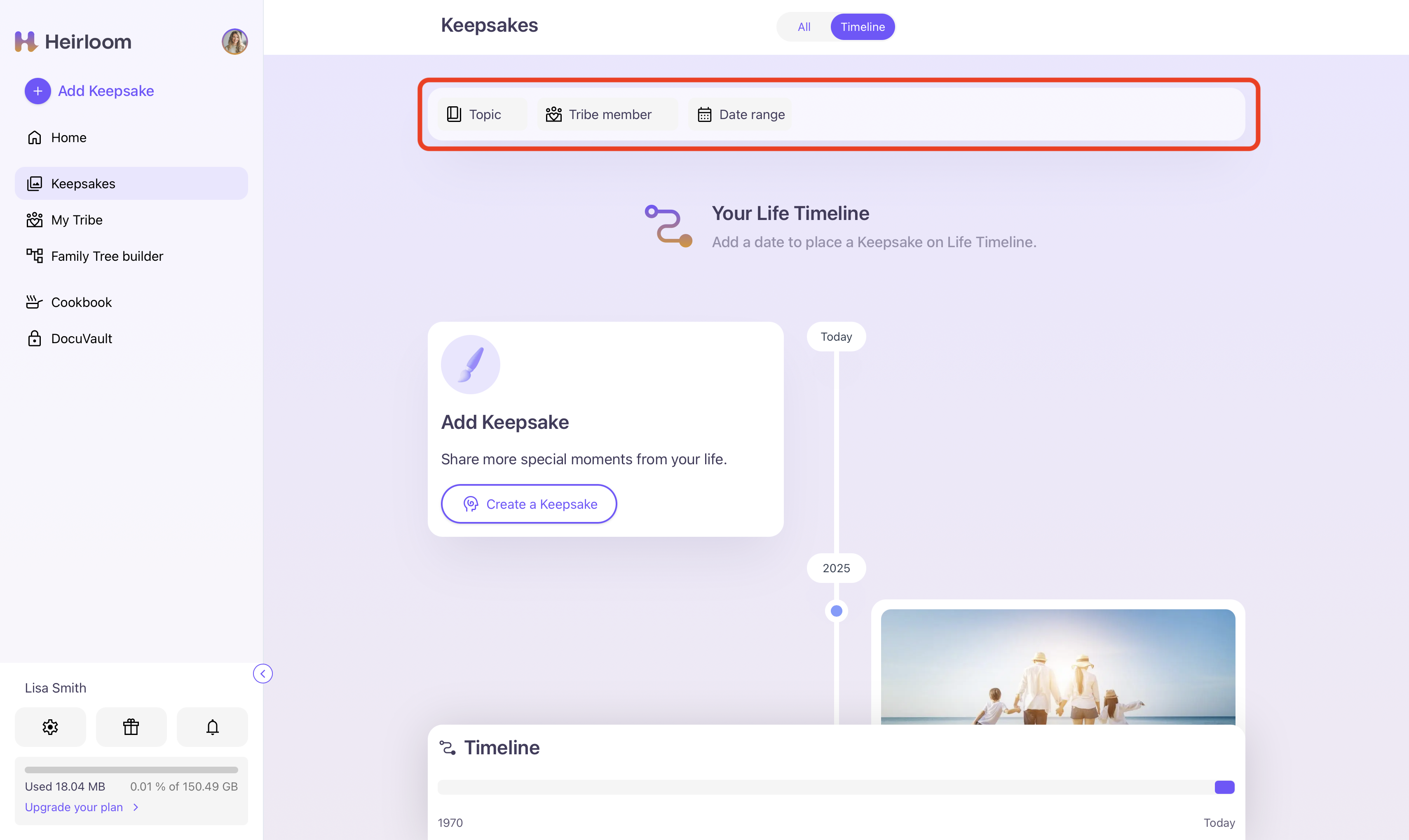 If you are looking for a specific Keepsake on your Life Timeline, you can also filter your search through selecting a specific "Topic", "Tribe member" or "Date range", which are all located at the top of the Life Timeline.