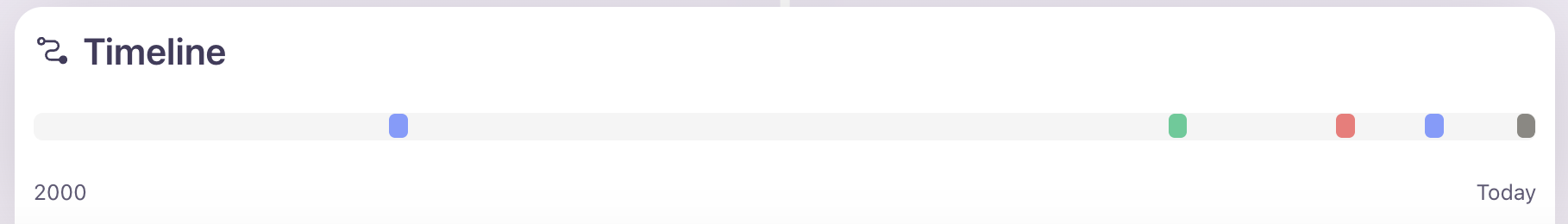 At the bottom of the Life Timeline view, you will find a horizontal bar displaying each of your dated Keepsakes in a condensed manner. The color of each node will represent the topic you assigned to the Keepsake, but if you have multiple Keepsakes in quick succession then they will display as a purple cluster.